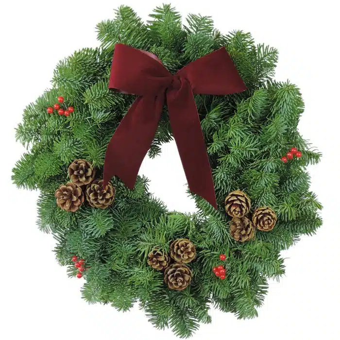 A timeless design that proves ever popular for those who want a festive wreath with a classic understated look. The simple fir base is decorated with a few pine cones, some faux red berries and finished with a burgundy bow. Made with Noble Fir cuttings, the Noble Red Wreath will look great on your front door.